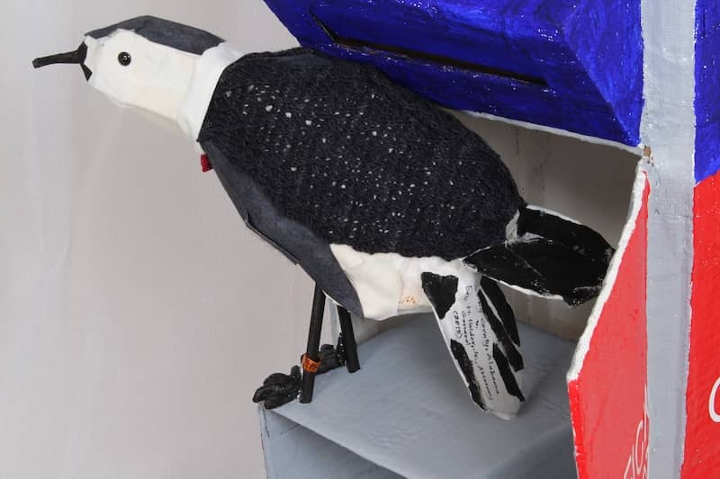 The setting for this work is a ballot drop box in my town, your town, or any town. In real life, voters may deposit absentee and vote-by-mail ballots in these secure containers. They make voting accessible in the days and weeks before Election Day and during hours when election and city clerks’ offices might be closed. A ballot drop box to expose the violation of voters’ rights in a tangible way.