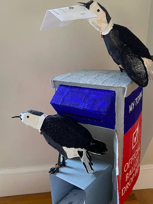 Wearing formal black robes with white shirt collars and red silk neckties, the birds are dressed as Supreme Court justices. Their stark black and white attire stands out against the patriotic red, white, and blue of the ballot box. The bird-justices are not sitting in court listening to legal arguments and issuing well-reasoned decisions. Rather, they have broken into that sacred container and overturned the storage bin, spilling the contents on the ground. One has with a ballot in his mouth as he gets ready to take flight.